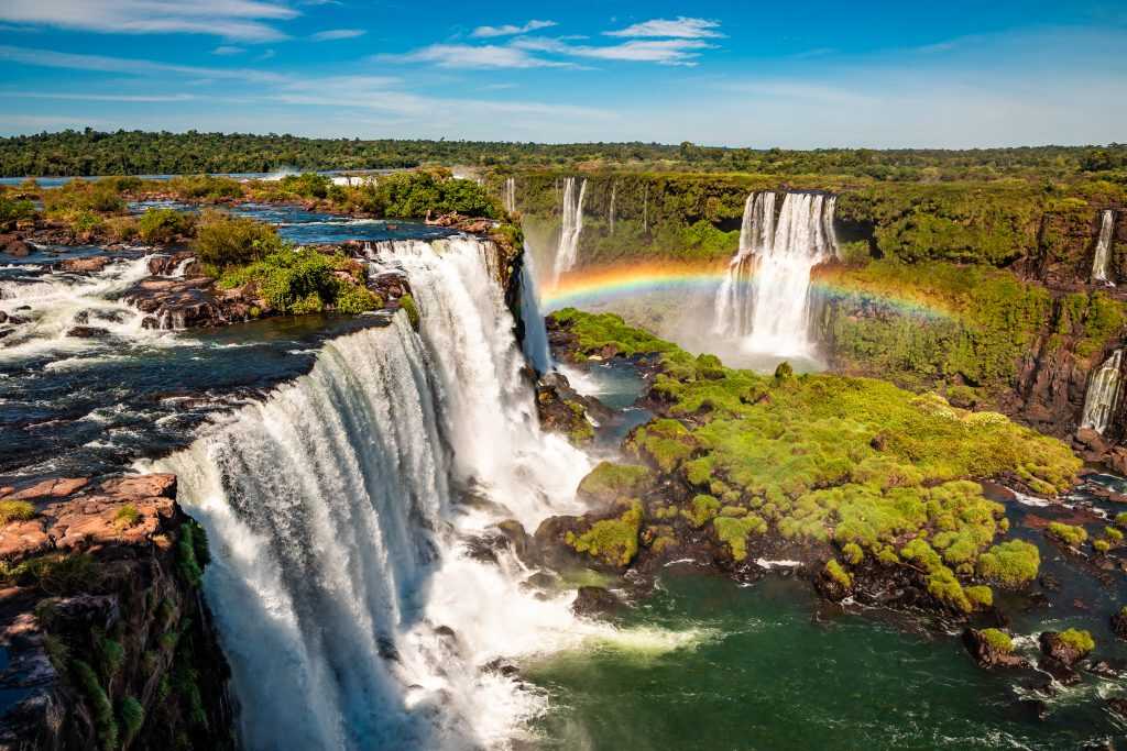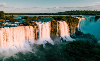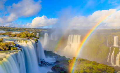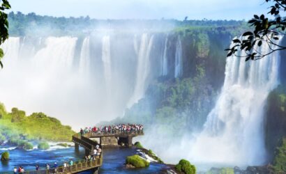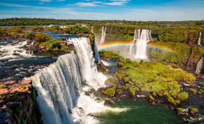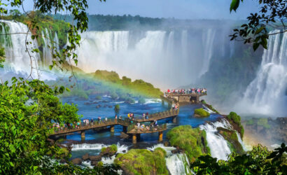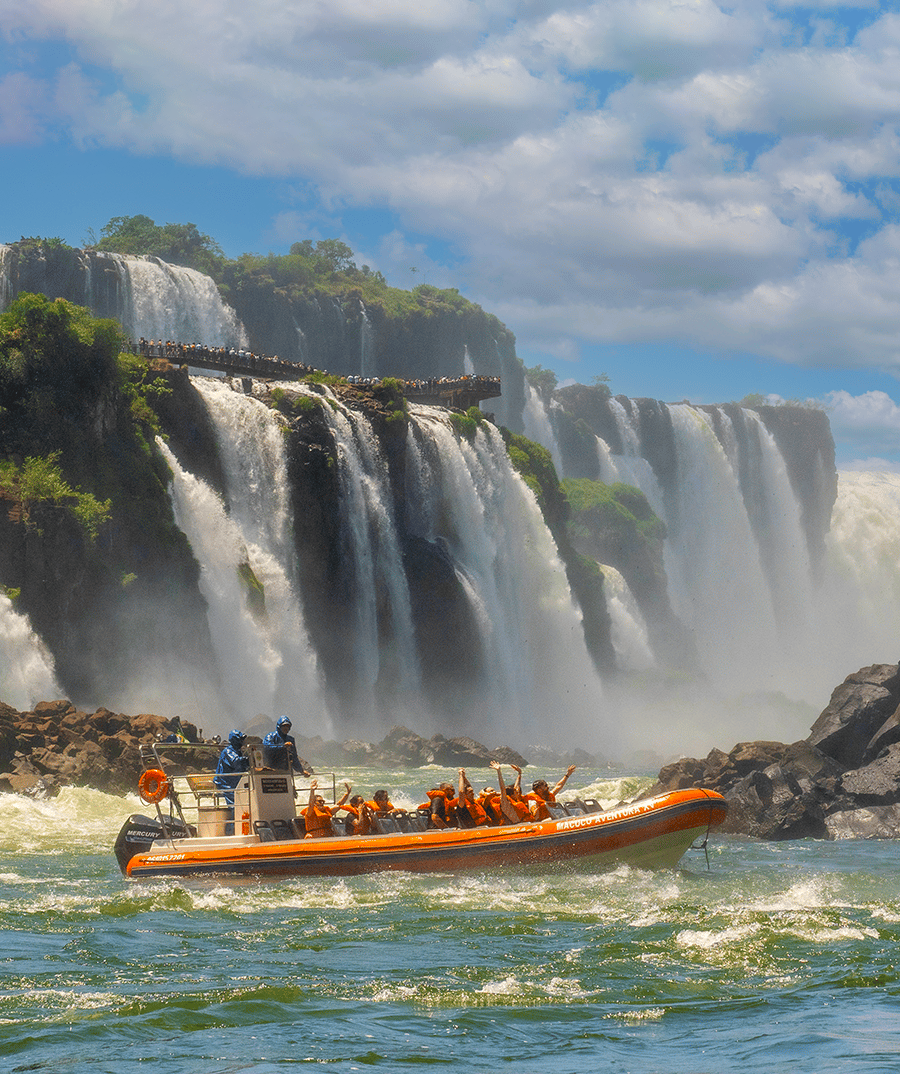 Foz do Iguaçu, a city in the Brazilian state of Paraná, is the main base for visiting the famous Iguaçu Falls, one of the largest waterfalls in the world. With a length of 2.7 km and spanning the border with Argentina, the falls are composed of hundreds of cascades, including the Devil’s Throat, with a height of 80 meters. Inflatable boat rides, during which tourists get drenched, are a very common way to appreciate this natural spectacle.