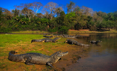Known as the “home” of many species of plants and animals, the Pantanal is famous for its concentration of wildlife, including jaguars, blue macaws, and giant otters (which are a type of large otter that lives in groups).